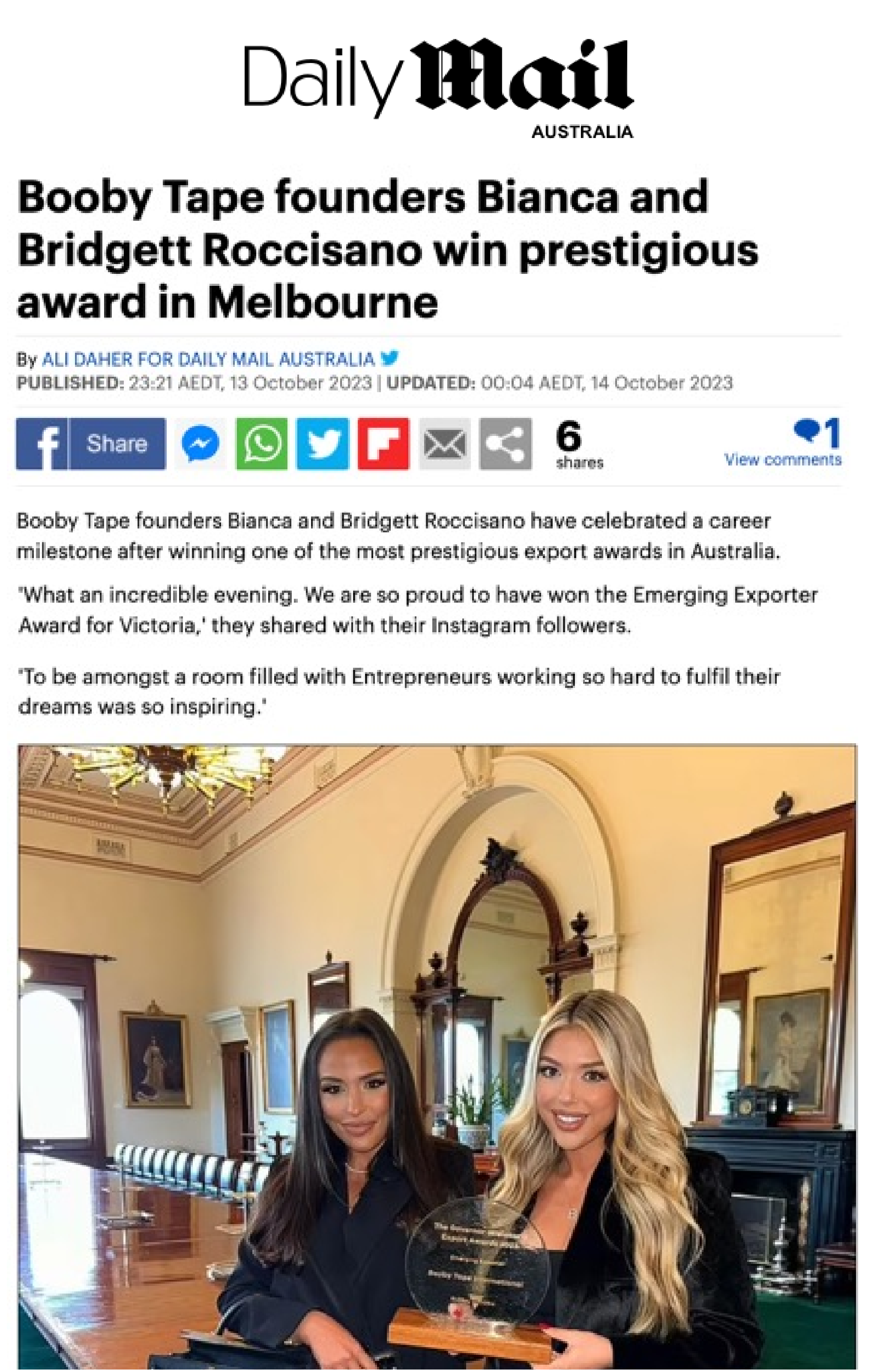 Female led, entrepreneur sisters Bianca and Bridgett Roccisano originally from a country town in Victoria, Australia invented the World’s First and Original Breast Lift tape, globally recognised as Booby Tape.