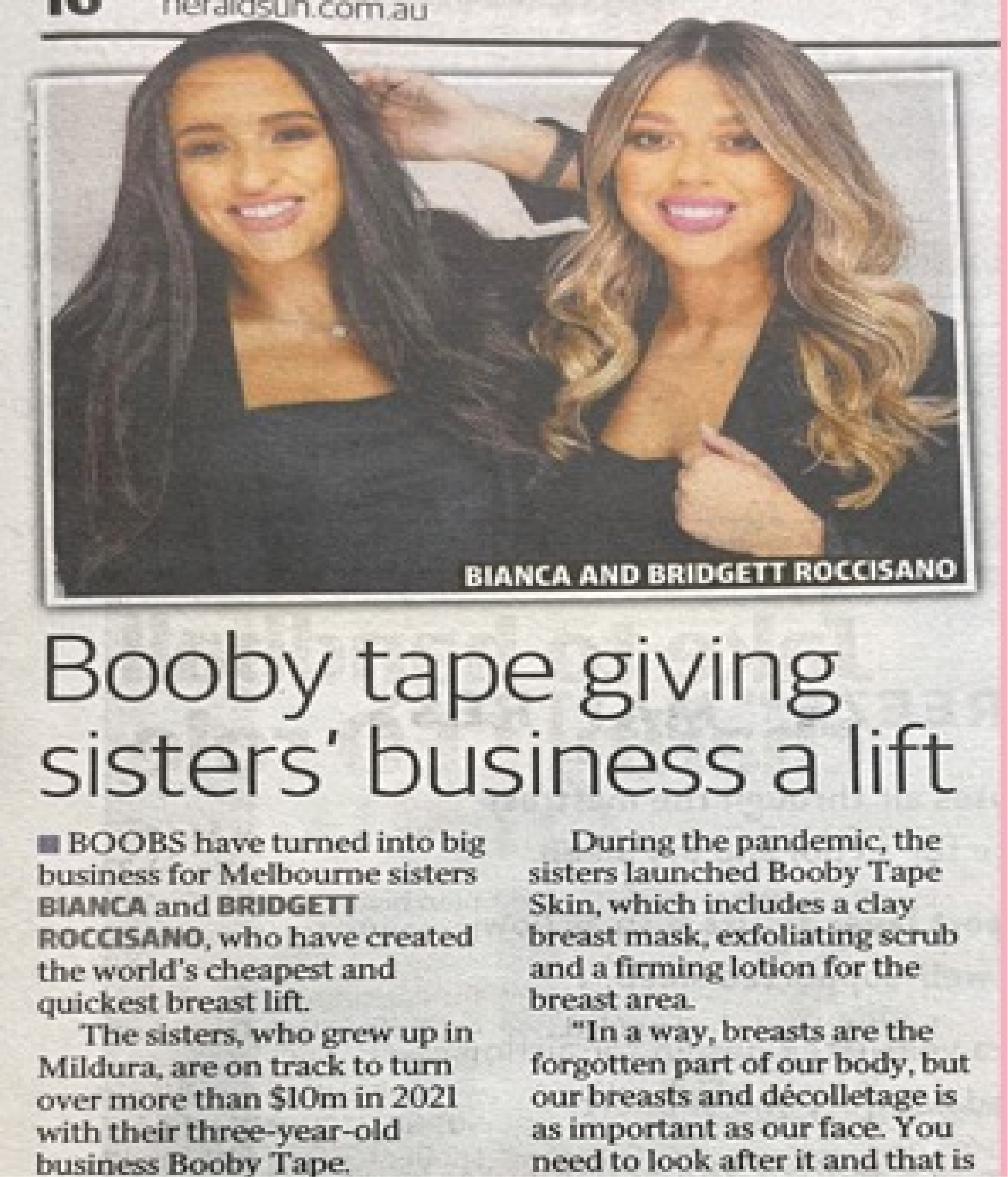 Female led, entrepreneur sisters Bianca and Bridgett Roccisano originally from a country town in Victoria, Australia invented the World’s First and Original Breast Lift tape, globally recognised as Booby Tape.